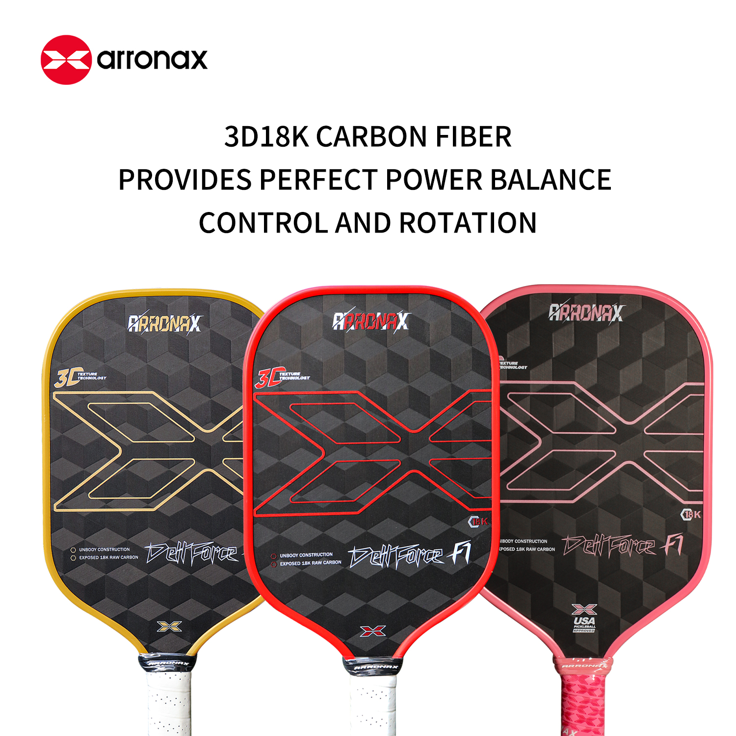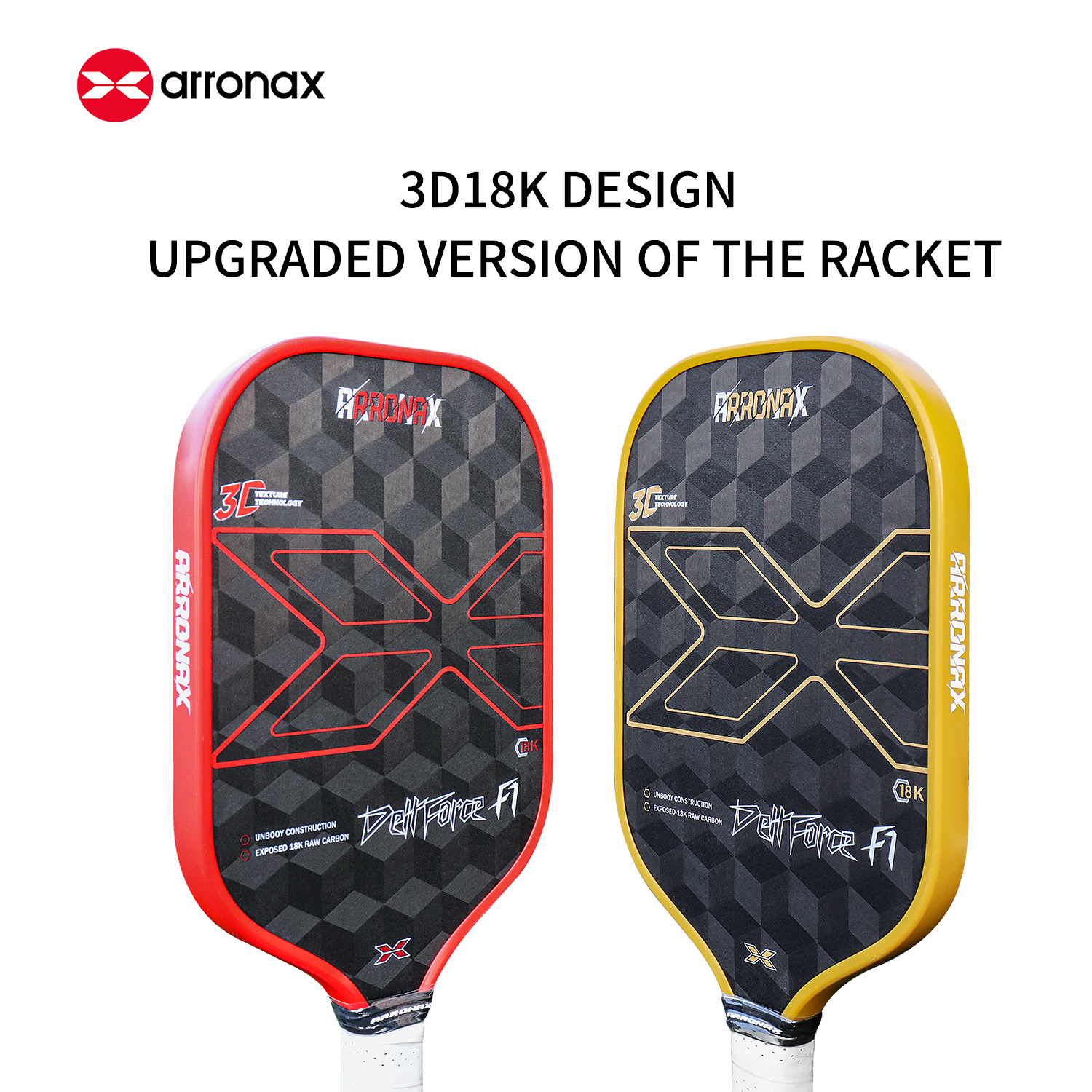The ARRONAX DELLFORCE F1 Pickleball Paddle is crafted for players seeking the perfect balance between control and power. Built with premium 18K CFS three-dimensional woven carbon fiber material, this paddle offers exceptional durability and performance. The vacuum sandblasting technology enhances the paddle's spinning ability, allowing players to apply precision spin shots while maintaining stability across the entire surface, from the center to the edges.